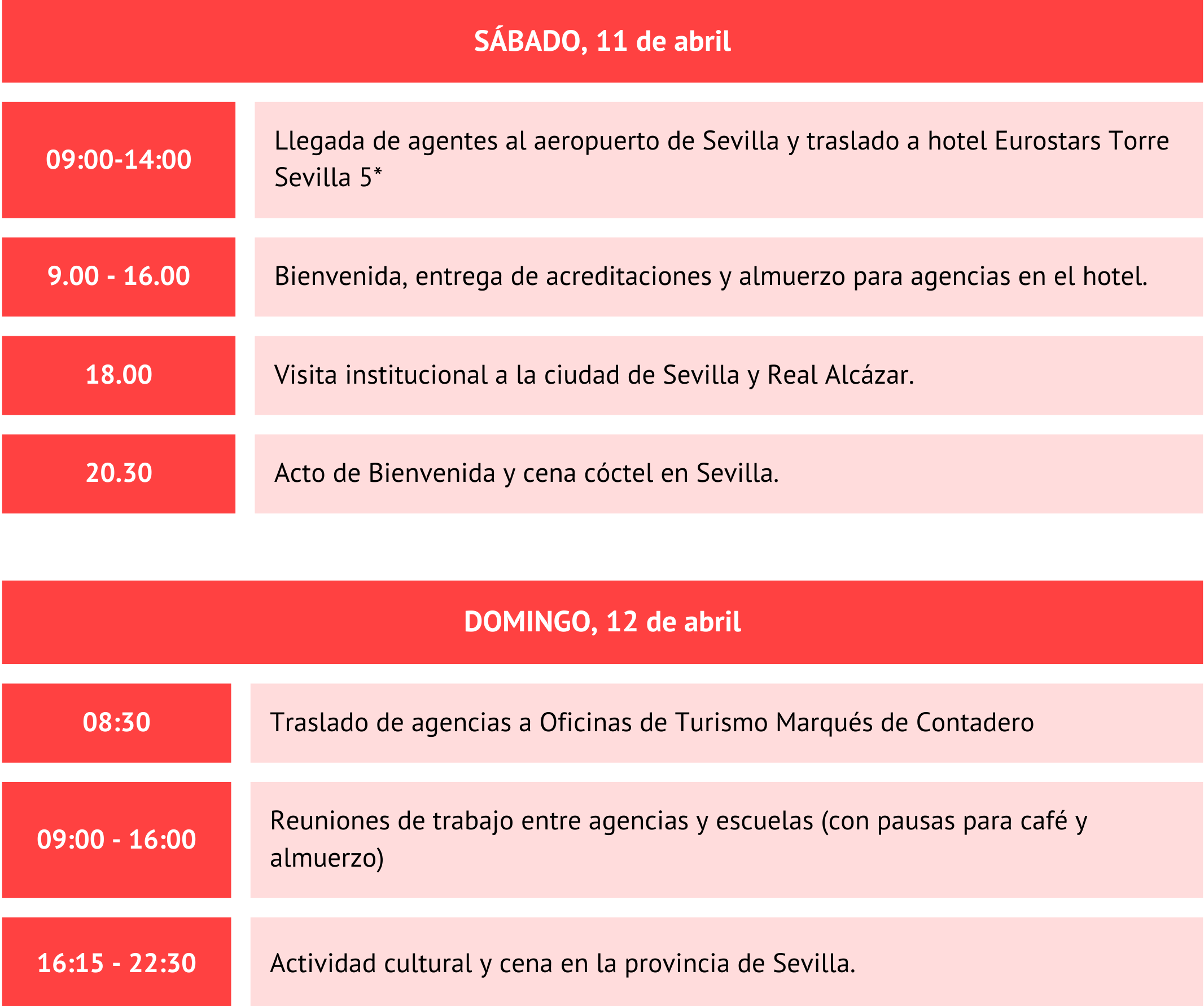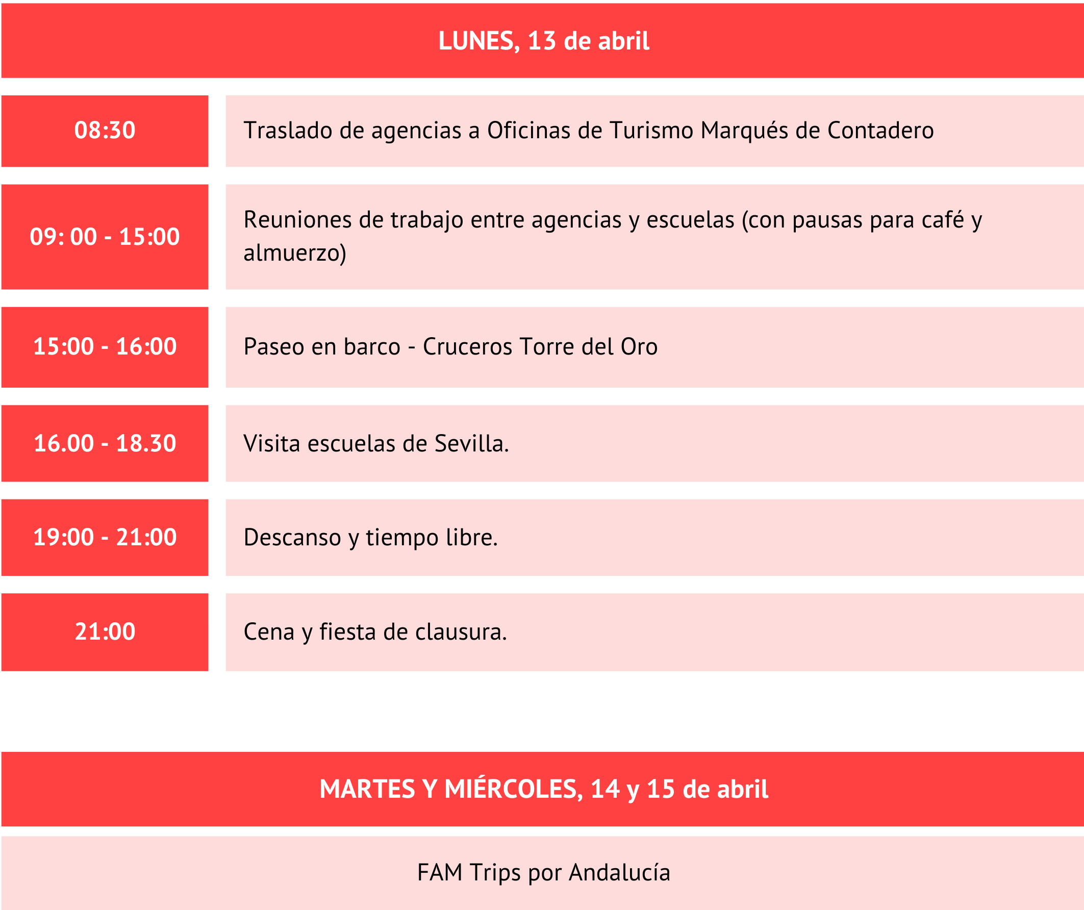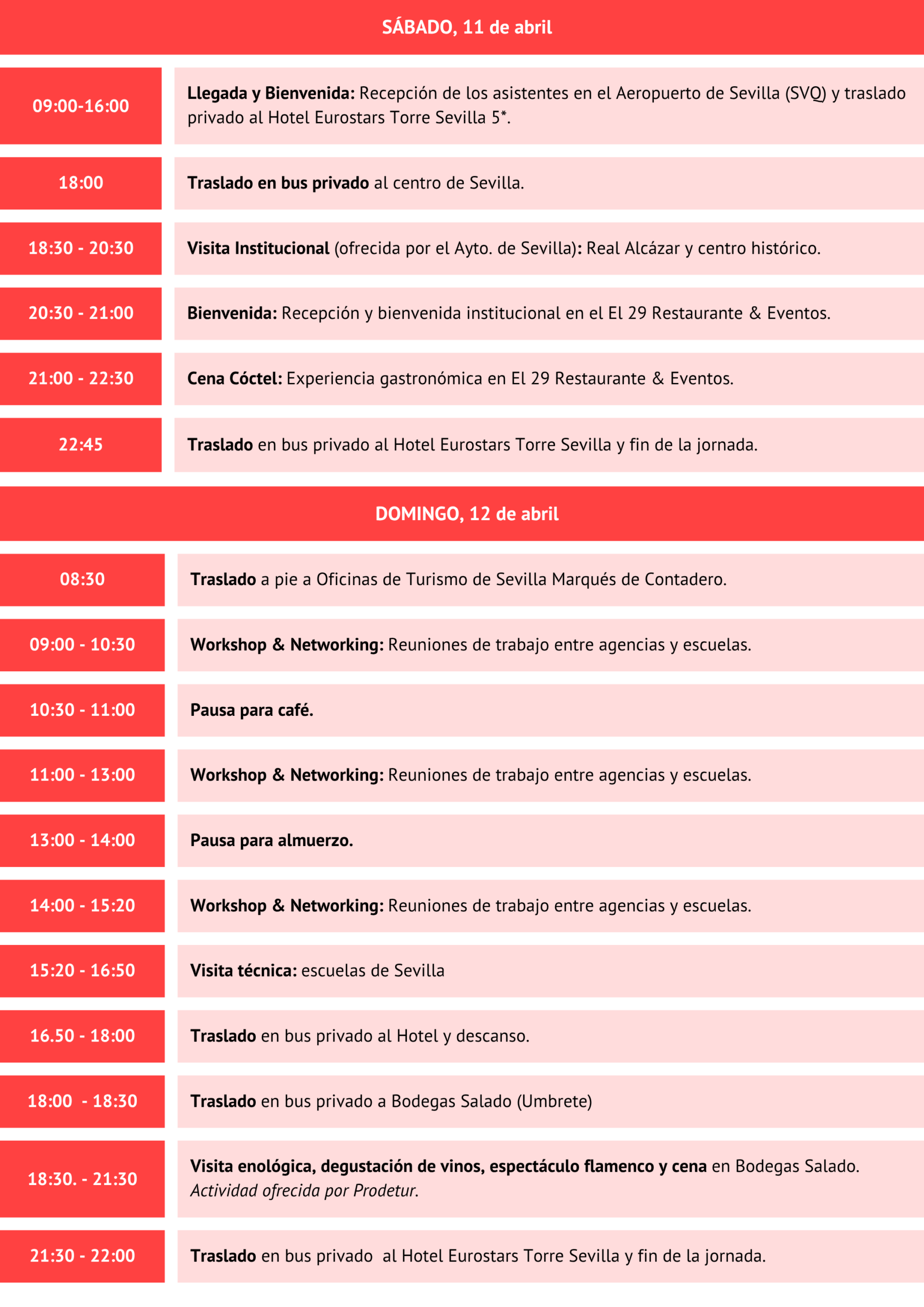 La metodología del evento se basa en citas preestablecidas entre representantes de agencias y de escuelas. Cada empresa tendrá un máximo de 38 reuniones de 20 minutos. Se promoverá un programa de seminarios y encuentros presenciales, además de otras actividades culturales y un FAM Trip posterior por Andalucía.
